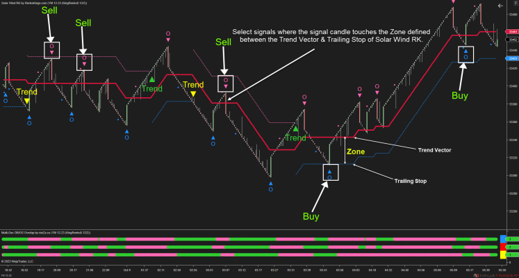 - Filtered out by the trend indicated by Solar Wave RK, reversal signals from Multi-Osc OB/OS Overlap transform into advantageous pullback signals.