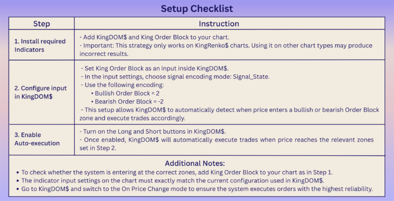 King Order Block spots strong supply and demand zones on Renko charts, which are areas where price is likely to reverse, helping define high-probability entry areas with clear structure and context.